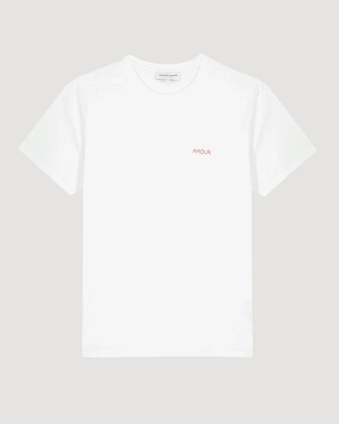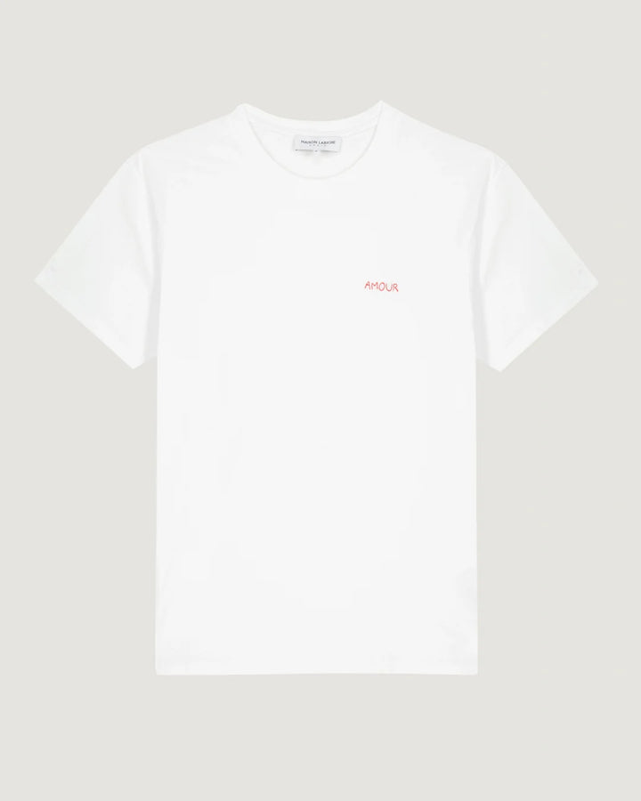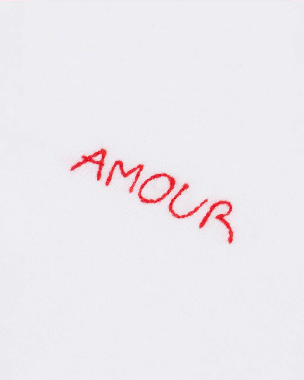 Made from 100% organic cotton, this T-shirt features a crisp white fabric that is soft, lightweight, and breathable. The chest is adorned with delicate red "Amour" embroidery, adding a romantic and sophisticated touch to the design. The neckline is finished with edge-to-edge glueing, ensuring a clean and polished look.