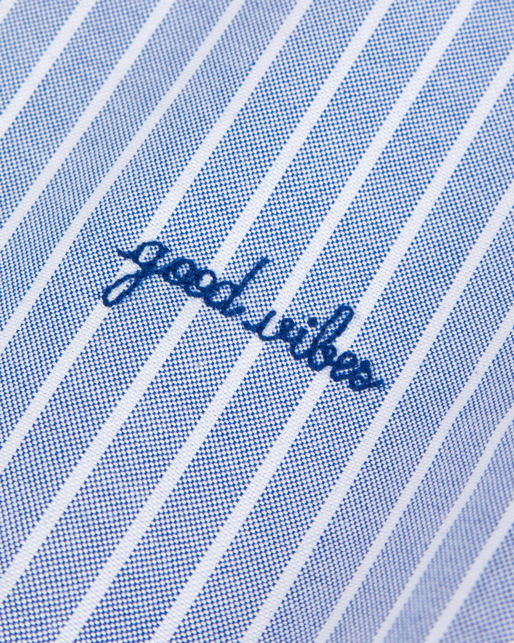 Fabricată din 100% bumbac organic, cămașa are un model cu dungi albastre, completat de o broderie rafinată "Good Vibes" în albastru marin, care adaugă un farmec subtil. Materialul ușor oferă respirabilitate și confort, iar croiala relaxată subliniază sofisticarea casual. Gulerul clasic și închiderea frontală cu nasturi completează designul bine definit.
